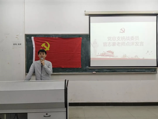 大会第七项议程党总支统战委员官志豪老师点评发言。官志豪老师表示本次会议准备工作充分、有序,全体党员能积极发言,全面仔细查找自身问题,准确、透彻剖析问题,并对全体党员真实客观的发言和敢于提出建议表示赞许。他强调,在今后工作中,要抓牢问题整改,全体党员齐心协力扎实做好落实工作;要做好密切联系群众的工作,深入群众所想所需所求;不断增强组织观念、责任意识和理论素质,坚定理想信念。同时,作为员工党员要起到先锋模范作用,严格要求自己,要履行党员职责和党员义务,希望大家不忘初心,砥砺前行!