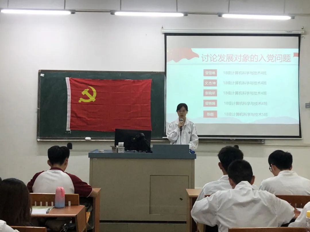 讨论发展对象的入党问题,16名发展对象依次上台宣读入党志愿书,他们将自己的具体信息和生活、学习等情况向党组织进行汇报,表示自己将会以党员的标准来严格要求自己,也希望自己可以在党组织的培养下,不断加强理论知识学习,严格践行党员标准,充分发挥党员的先锋模范作用。随后与会的正式党员讨论发展对象的发展问题,拥有表决权的党员逐一对16名发展对象进行不记名投票表决。经表决,一致同意接收汪逸秀等16名同志为中共预备党员。