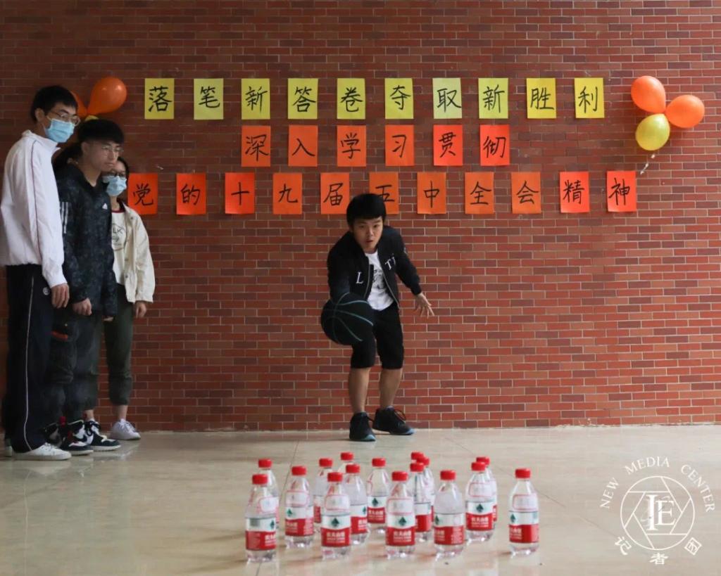 活动一:扔“保龄球”。地面上放置着16个表面贴有词汇的废弃饮料瓶,其中12个是社会主义价值观关键词,而剩下四个是其他词汇。参与者需站在距离饮料瓶2米以外并用篮球击倒饮料瓶,每击中一个贴有关键词的饮料瓶则小组加分,相反击中其他词汇则扣分。每组成员在观察饮料瓶上的词汇后,讨论击中关键词的技巧。经过几次的尝试后,逐渐摸索出这个活动的要领,有些小组代表更是如有神助,所向披靡。