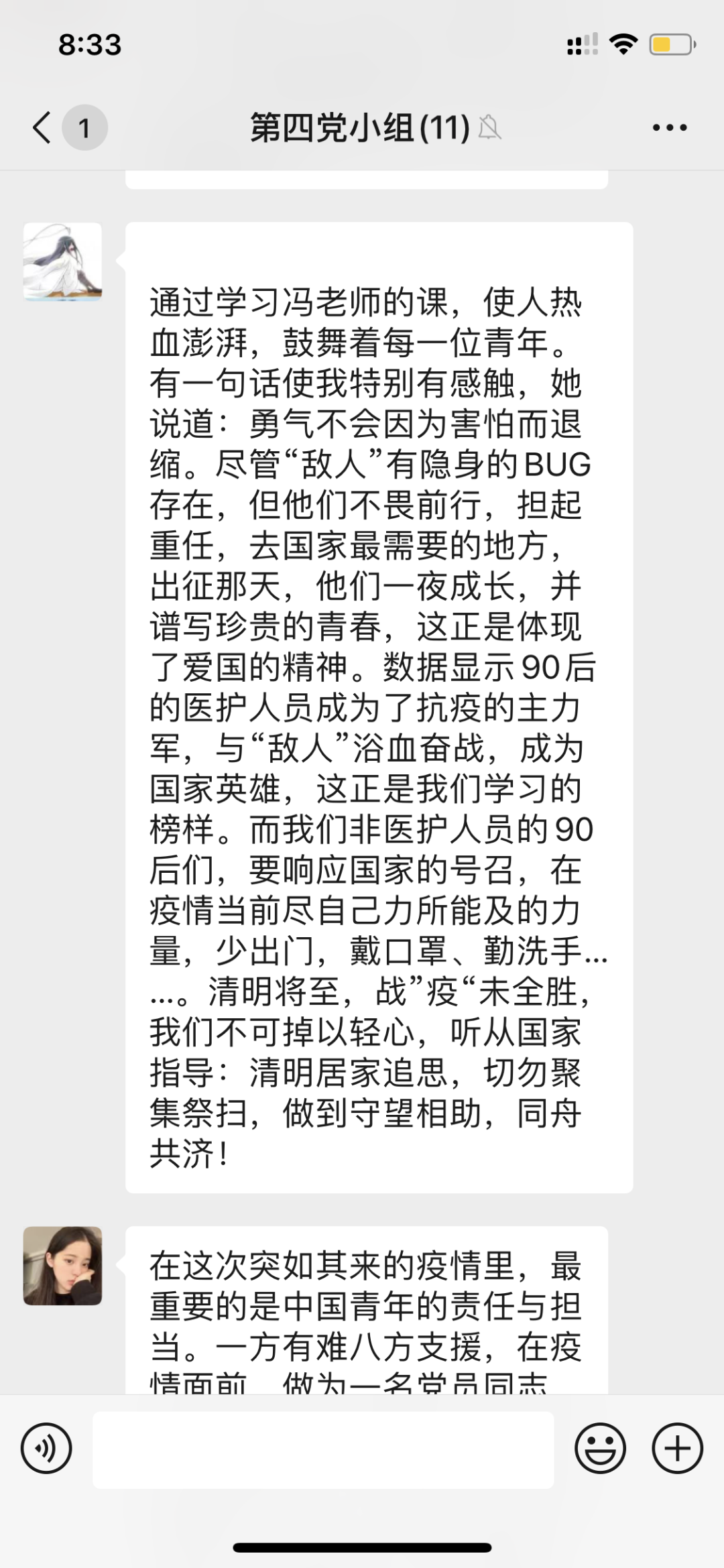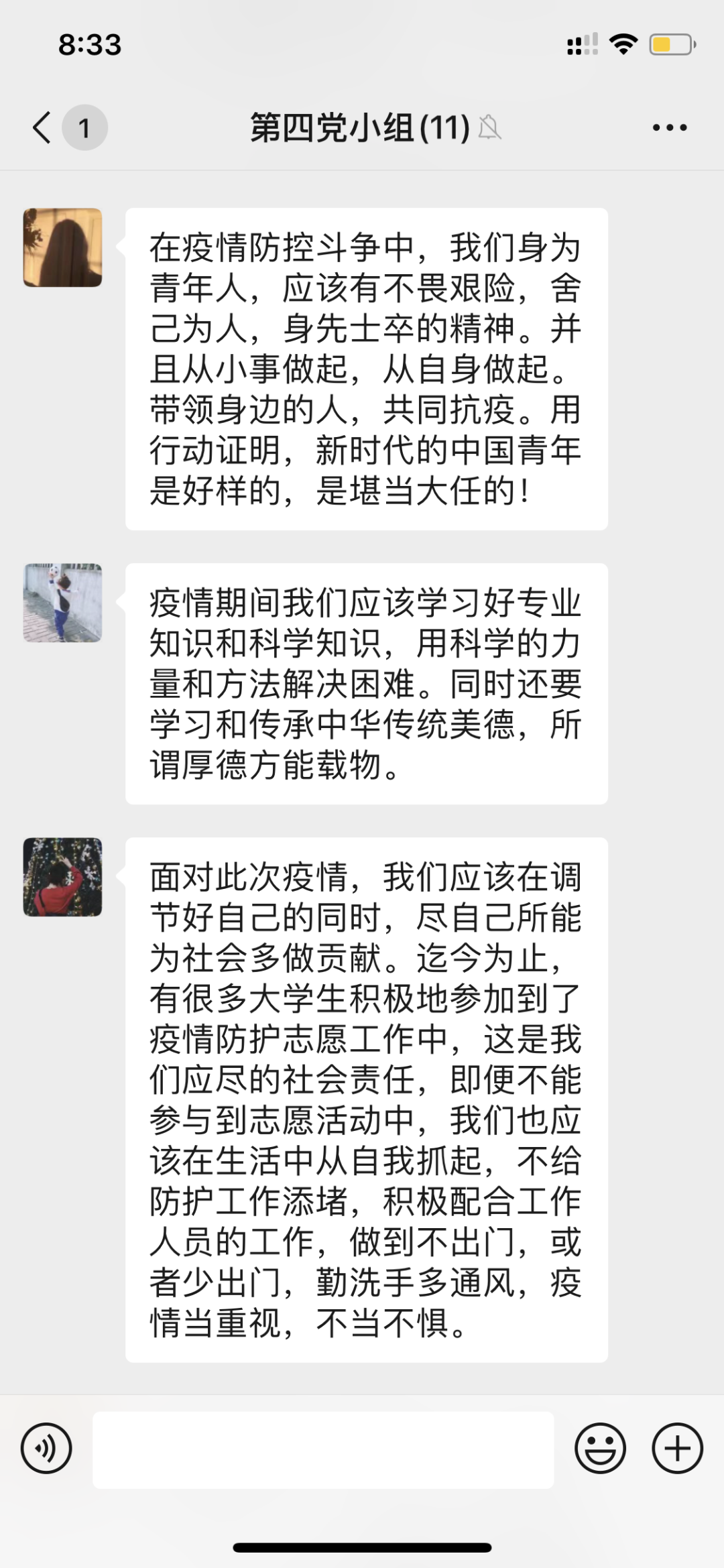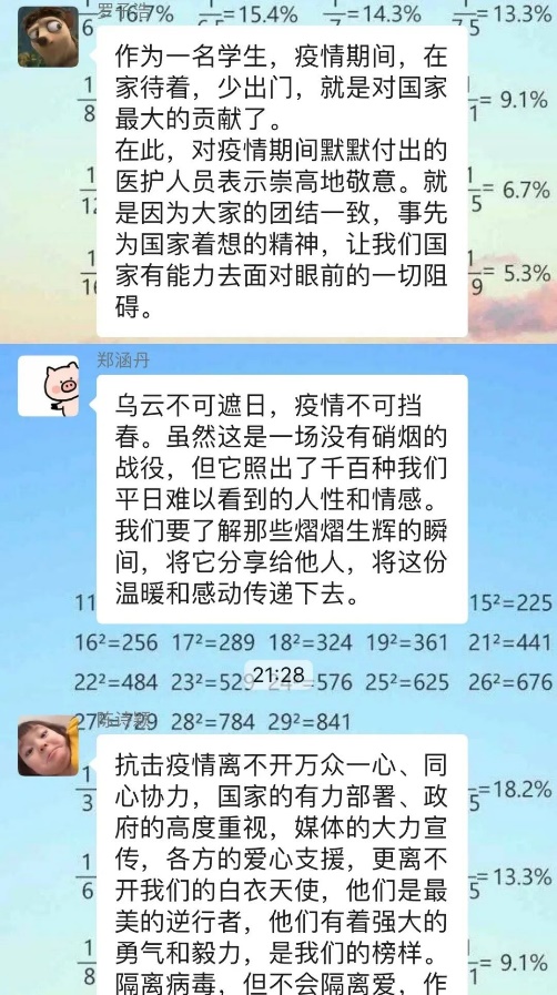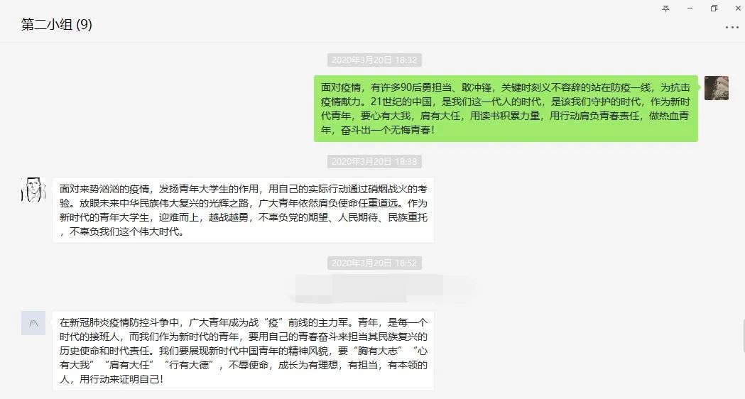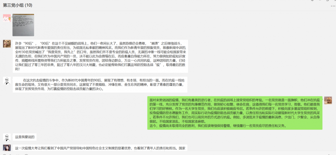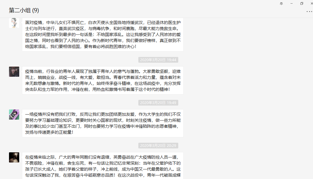 “青年一代有理想、有本领、有担当,国家就有前途,民族就有希望。”习主席的这一句话铿锵有力。“我是党员,我先上”,“许多90后,00后在这个不见硝烟的战场上,他们一夜间长大了,虽然恐惧仍会勇敢,“崩溃”之后继续战斗,展现出了新时代新青年爱国的责任担当,为祖国无私奉献的精神风采”这些精彩的发言,让组员们振奋不已,青年一代也有属于自己的青春奋斗。