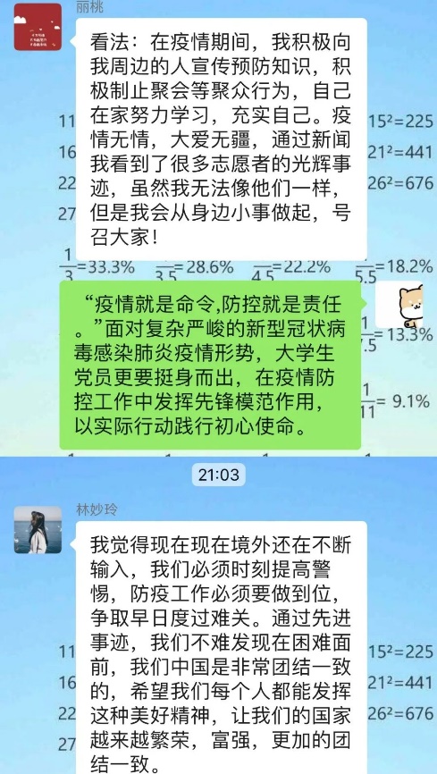 同时表达了自己作为一名员工党员,要在这特殊的时期发挥党员的先锋模范作用,时刻关注疫情现状,积极支持当地的抗疫工作。在学习方面严格要求自己,响应国家“停课不停学”的号召,做到按时按量学习线上课程。