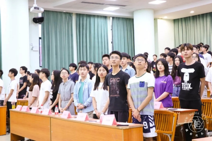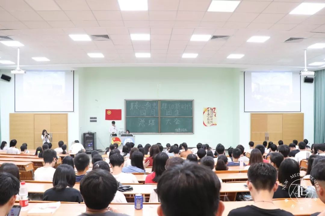 会议第一项为奏唱团歌。同学们在主持人冯泽禹同学的带领下肃然起立、面向团旗,庄严地奏唱团歌。随后,是四月团生举办的一系列活动的视频回顾。通过该段视频,我们深刻地认识到当代青年应当在习近平新时代中国特色社会主义思想的指引下,不忘初心跟党走、青春建功新时代、用奋斗谱写新时代的青年精神。