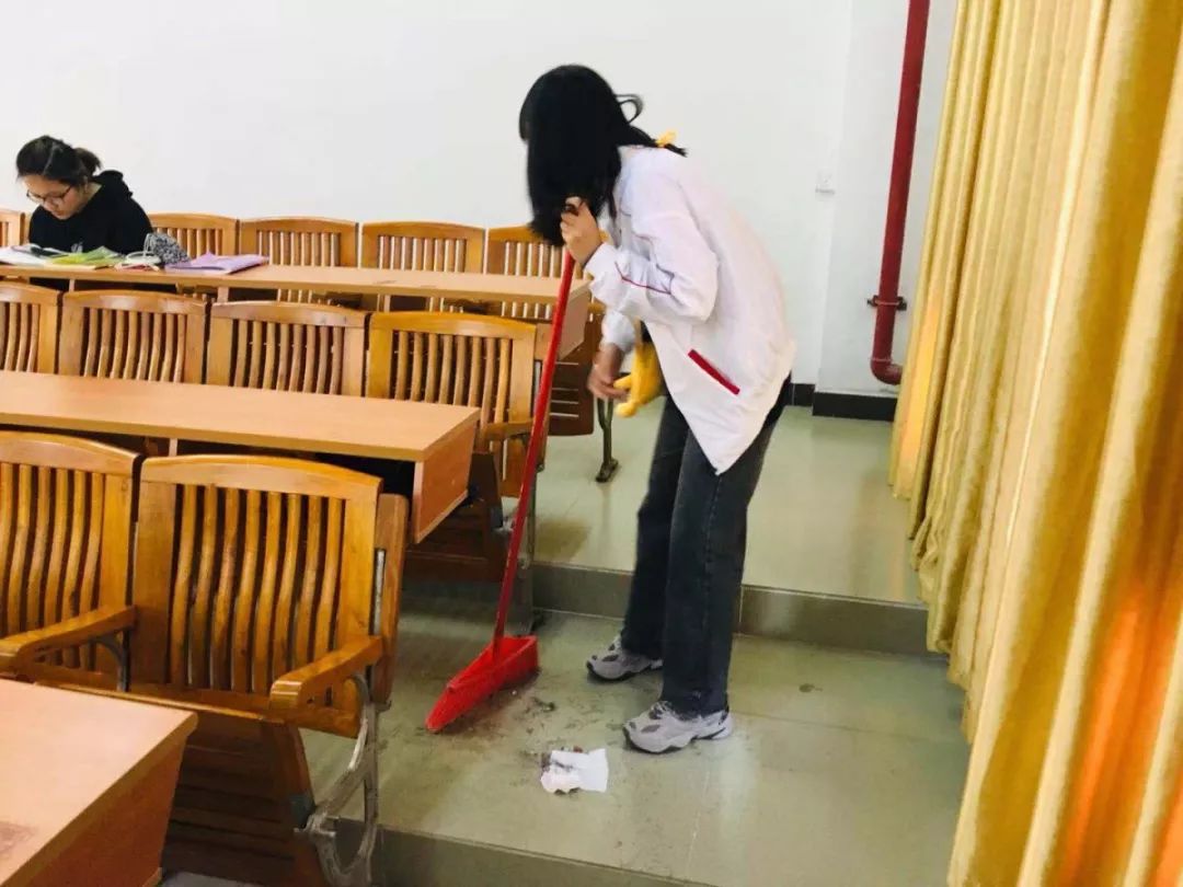 在清扫期间,每一位志愿者都秉承着吃苦耐劳的精神以及细心负责的态度来完成这项工作。在志愿者们长达两个半小时的清扫活动中,他们积极清扫垃圾,不怕脏、不喊累,兢兢业业,互相配合,最终他们用自己的实际行动为教室的环境增添了一份清、一抹明亮。他们每一次弯腰的姿态都写满了认真和努力。