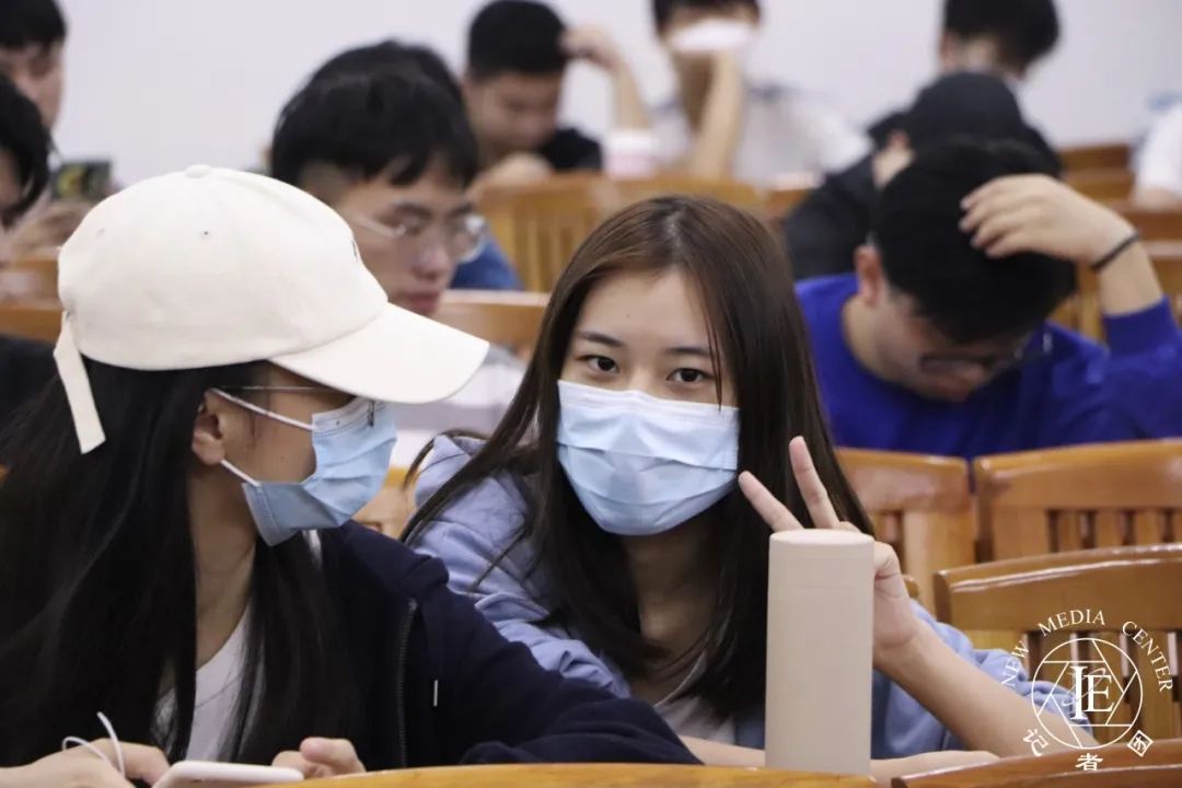 在电影开始之际,参与观看爱国电影的同学纷纷赶在影片开始前,进行入场、签到。已入场的同学在座位上相互轻声探讨,迫不及待地等待着这场电影的播放。后续进场的同学也很快就融入其中。