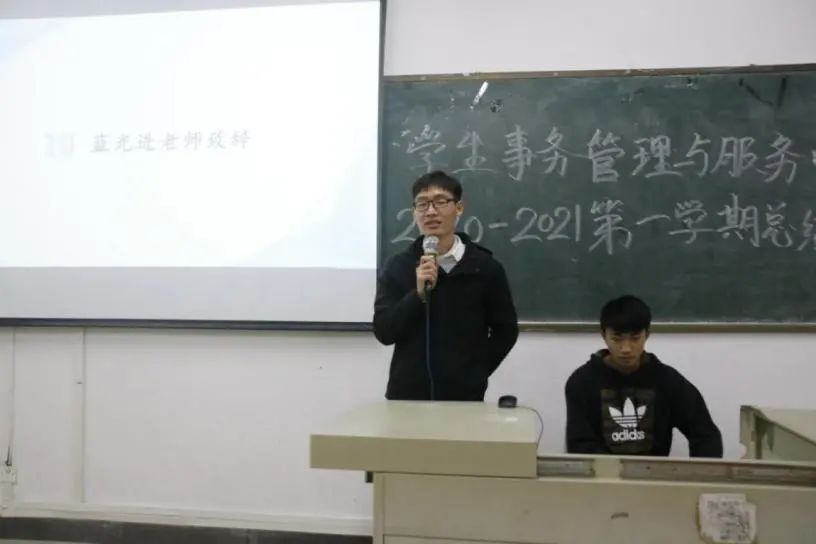 蓝光进老师发言。蓝光进老师首先感谢员工事务管理与服务中心全体成员在本学期的付出,所有成员在组织里得到了充分的锻炼,积累了经验。同时,在主任和各部长的带领下,大家勤奋学习,勇于实践,不断进去,在许多方面取得了较好的成绩。最后,蓝老师提出组织活动的顺利开展,既要有组织人员,也需要技术人员。老师希望同学们要多学习专业知识技术,将所学的专业知识运用于工作中。