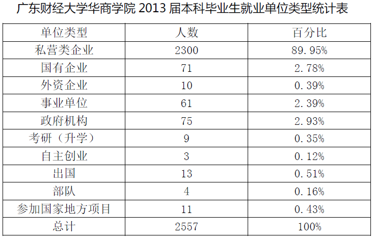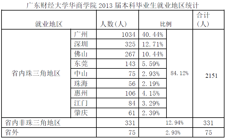 截至 2013 年 8 月 29 日止,公司 2013 届已就业本科毕业生总数为2557 人,其中在珠三角地区就业的有 2151 人,占已就业本科生人数的84.12%;在省内珠三角地区以外的有 331 人,占全校已就业本科生人数 12.94% ;在外省就业的有 75 人,占全校已就业本科生人2.93% .详情请参看下表。