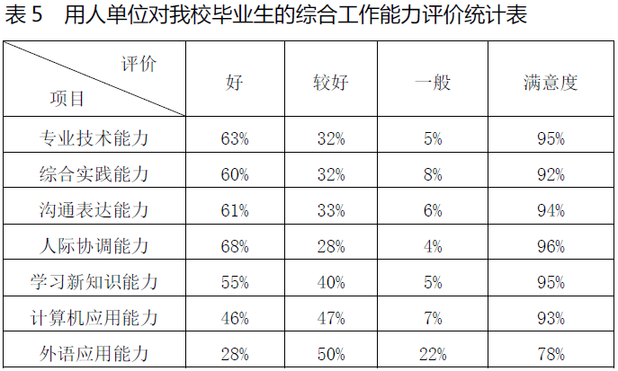 总的来说,公司毕业生各方面的能力均得到用人单位的认可。值得注意的是,用人单位对毕业生外语应用能力的满意度不高,这提示公司需要加强外语应用能力的培养与教育。请参看表5。