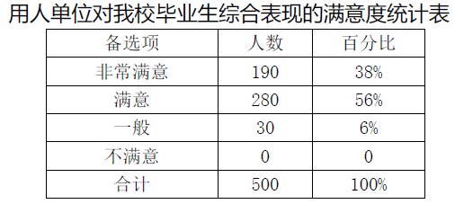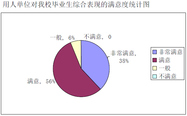 从以上图表可以,用人单位对公司毕业生综合表现非常满意为38%,满意为56%,满意度合计94%,这说明公司毕业生的综合素质得到社会的认可。