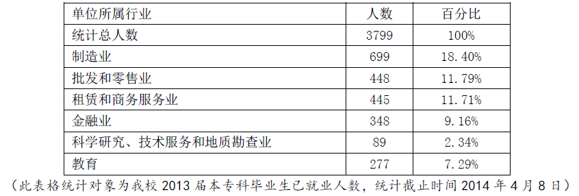 从以上数据可以看出:就业所属行业的分布情况与公司的专业设置不完全吻合。据调查,公司 2013 届毕业生就业专业对口率并不高,多数从事与专业相关但不完全对口的工作。
