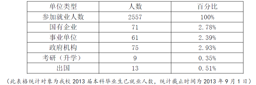 公司 2013 届毕业生就业主要流向为中小型企业,进入政府机构、事业单位、国有企业以及考上公务员、出国留学的比例较少。