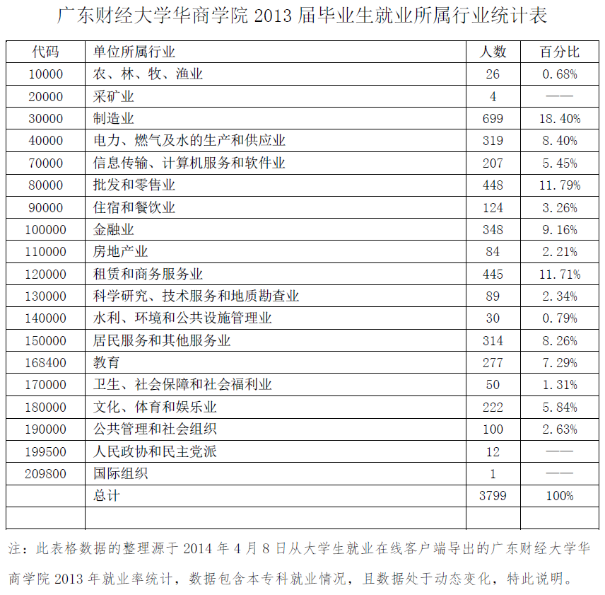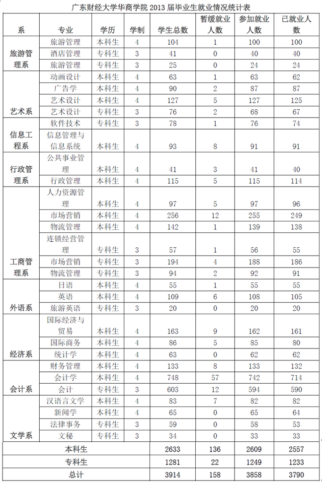 根据广东省教育厅粤教毕函【2013】29 号文通知,截至 2013 年 9 月 1 日,2013 年广东省普通高等公司毕业生(本专科)初次就业率为 95.86%(其中研究生为 93.72%,本科生为 94.93%,专科生为 96.96%),公司 2013 届毕业生(本专科)初次就业率为 98.24%,其中本科毕业生初次就业率为 98.01%,专科为98.72%,均高于全省的平均水平。