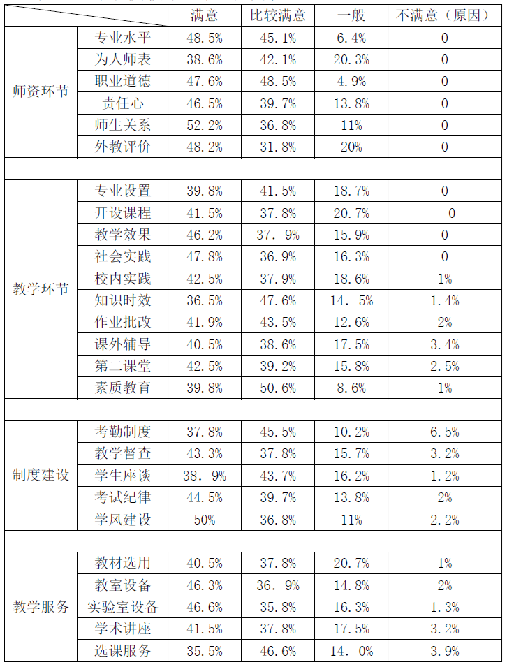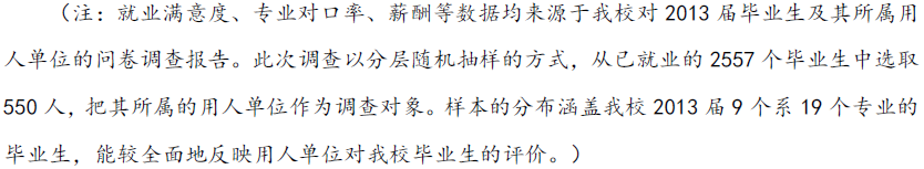为了解公司毕业生对公司教学管理的满意度,公司采用自编的调查问卷,对 2013 届的本科毕业生进行调查。以分层随机抽样的方式,从已就业的 2557 个毕业生中选取 550 人作为调查对象。样本的分布涵盖公司 13 届 9 个系 19 个专业的毕业生,能较全面地反映毕业生对公司教学的评价。