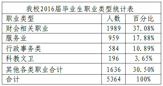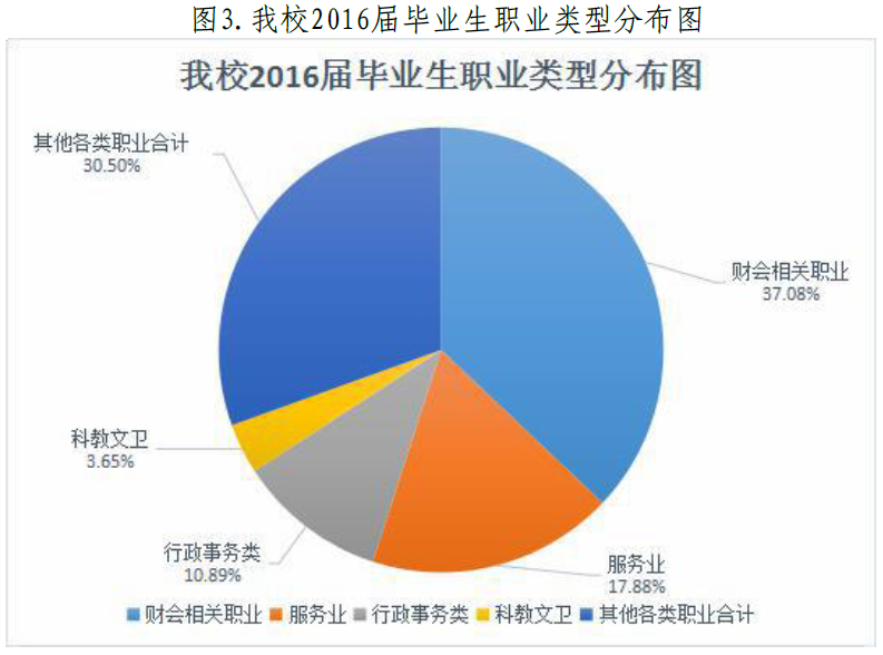 从职业类型分布来看,公司2016 届毕业生的职业类型,比例最高的为财会相关职业,占 37.08%;其次是其他各类职业,占 30.50%;再次是服务业,占 17.88%,行政事务类占 10.89%;科教文卫类职业占3.65%。