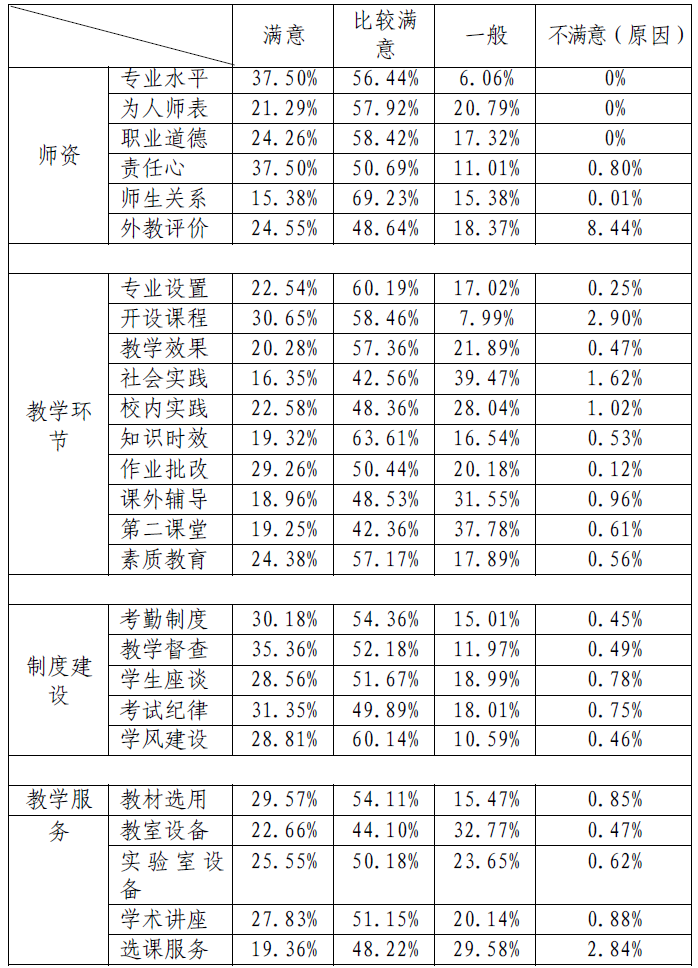 为了解公司毕业生对公司教学管理的满意度,公司采用自编的调查问卷,对 2016 届的本科毕业生进行调查。以分层随机抽样的方式,从参加就业的5455 个毕业生中选取 1630 人作为调查对象。样本的分布涵盖公司2016 届 8 个院系 25 个专业的毕业生,能较全面地反映毕业生对公司教学的评价。