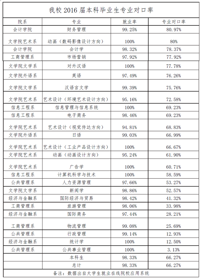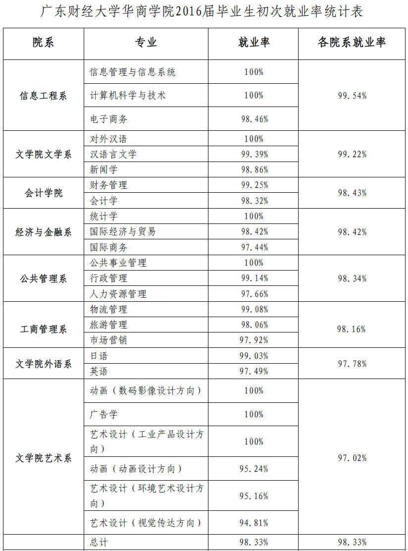 根据广东省教育厅粤教毕函【2016】43 号文,2016 年全省共有 50.54 万名高校毕业生,截止 2016 年 9 月 1 日,我省 2016 年普通高等公司毕业生初次就业率为95.11%(其中研究生为 91.51%,本科生为 94.80%,专科生为 95.75%)。公司 2016 届毕业生(均为本科)初次就业率为98.33%,高于全省的平均水平。