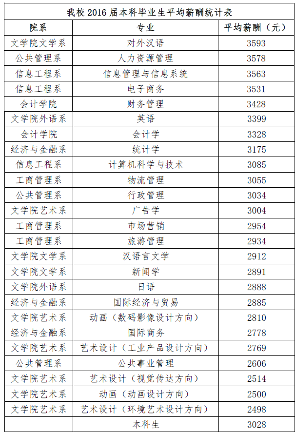 老员工就业在线院校应用系统中的数据显示,公司2016 年毕业生的平均薪酬约为3028元,其中最高的是对外汉语专业,平均薪酬3593元;其次是人力资源管理,为3578元;再次是信息管理与信息系统,为 3563 元。因为此项数据统计时间刚好为毕业生入职的实习期或者试用期,数据显示为毕业生的入职工资,比毕业生实际薪酬低。