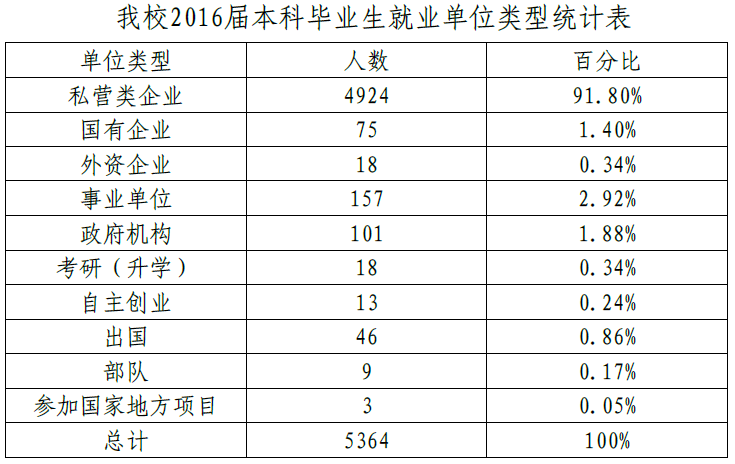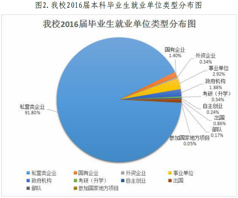 公司人才培养的目标是为广东中小企业及社会服务机构培养理论基础厚,实践能力强、综合素质高的高级应用型人才。从就业流向来看,公司 2016 届毕业生主要集中在私营类企业就业,这与公司的人才培养目标基本一致。公司的就业单位类型统计情况请参看以下图表。