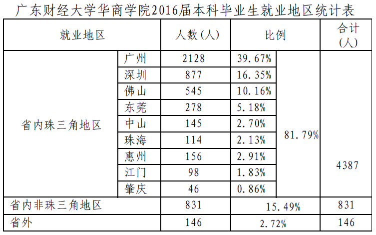 截至 2016 年 9 月 1 日止,公司 2016 届已就业本科毕业生总数为 5364 人,其中在珠三角地区就业的有 4387 人,占已就业本科生人数的81.79%;在省内珠三角地区以外的有831人,占全校已就业本科生人数 15.49% ;在外省就业的有 146 人,占全校已就业本科生人数2.72%。详情请参看下表。