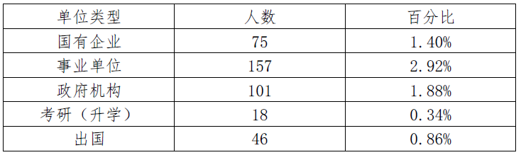 目前,公司毕业生的就业主要集中在中小型企业,到政府机构、事业单位、国有企业就业的比例不高。公司将进一步优化人才培养模式,提高毕业生的综合素质,在保持高就业率的基础上,努力提升毕业生的就业层次。