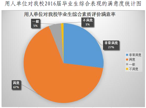 用人单位对公司毕业生综合表现非常满意为27%,满意为 67%,满意率合计 94%,这说明公司毕业生的综合素质得到用人单位的认可,反映出公司教学质量良好。