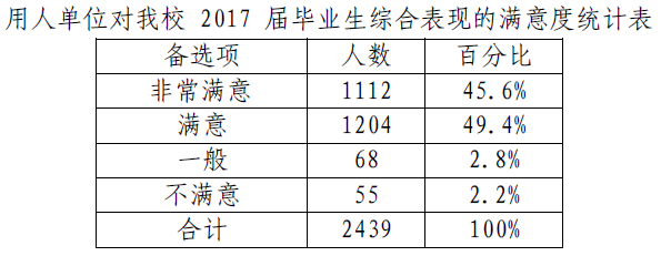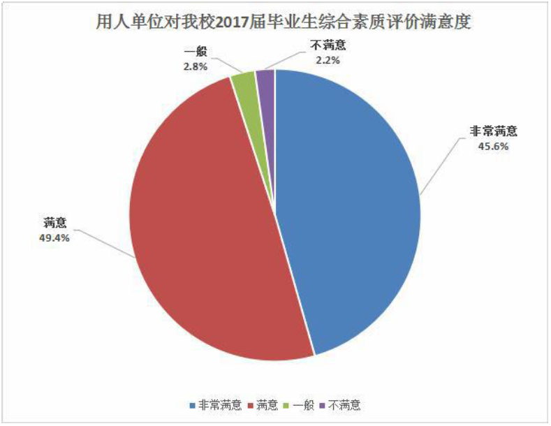 用人单位对公司毕业生综合表现非常满意为45.6%,满意为49.4%,满意度合计 95%,这说明公司毕业生的综合素质得到用人单位的认可,反映出公司教学质量良好。
