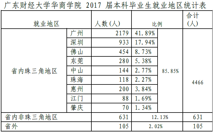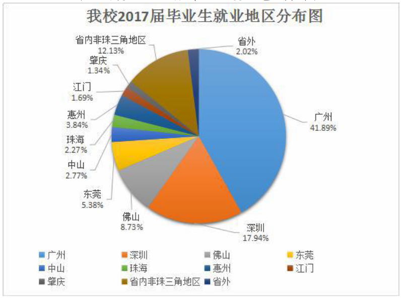 截至 2017 年 9 月 1 日止,公司 2017 届已就业本科毕业生总数为5202 人,其中在珠三角地区就业的有 4466 人,占已就业本科生人数的85.85%;在省内珠三角地区以外的有 631 人,占全校已就业本科生人数 12.13% ;在外省就业的有 105 人,占全校已就业本科生人数2.02% .详情请参看下表。