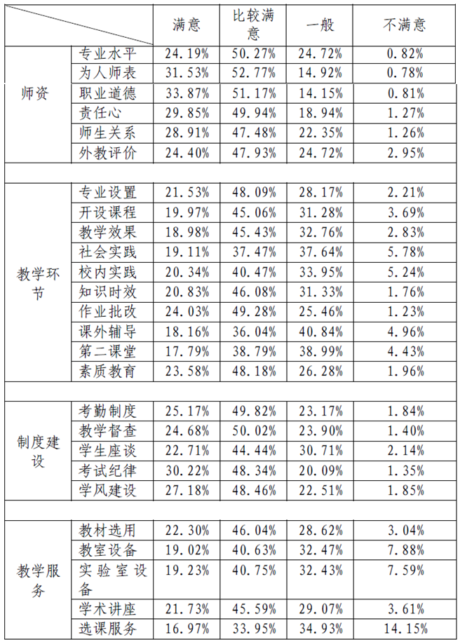 为了解公司毕业生对公司教学管理的满意度,公司采用自编的调查问卷,对 2017 届的本科毕业生进行调查。以分层随机抽样的方式,从参加就业的 5341 个毕业生中选取 2439 人作为调查对象。样本的分布涵盖公司 2017 届 8 个院系 25 个专业的毕业生,能较全面地反映毕业生对公司教学的评价。