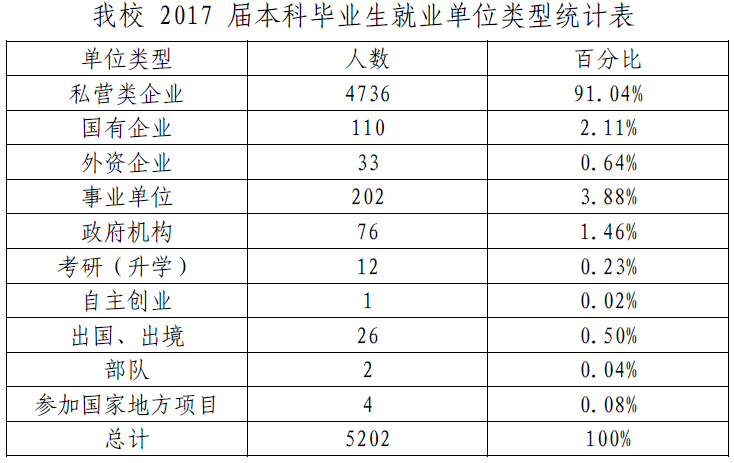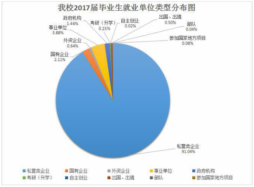 公司人才培养的目标是为广东中小企业及社会服务机构培养理论基础厚,实践能力强、综合素质高的高级应用型人才。从就业流向来看,公司 2017 届毕业生主要集中在私营类企业就业,这与公司的人才培养目标基本一致。公司的就业单位类型统计情况请参看以下图表。