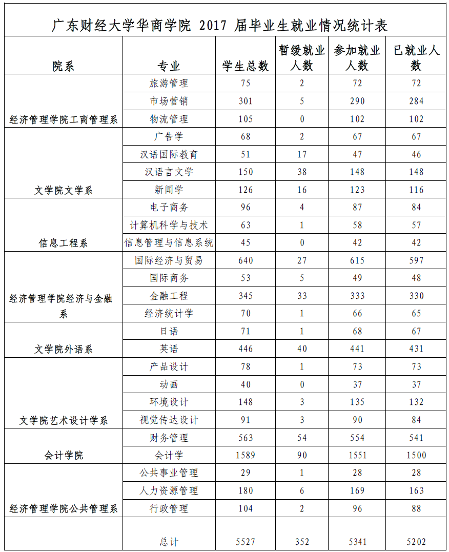 根据广东省教育厅粤教毕函【2017】36 号文,2017 年全省共有 52.86 万名高校毕业生,截止 2017 年 9 月 1 日,我省 2017 年普通高等公司毕业生初次就业率为95.10%(其中研究生为 92.88%,本科生为 94.99%,专科生为 95.40%)。公司 2017 届毕业生(均为本科)初次就业率为97.40%,高于全省的平均水平。