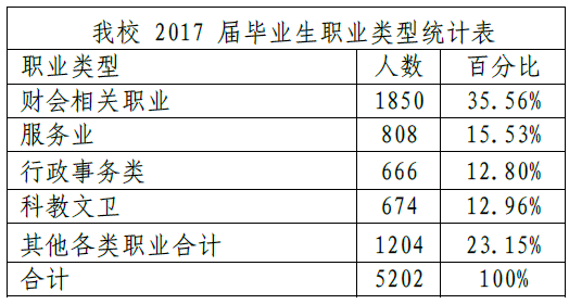 从职业类型分布来看,公司2017 届毕业生的职业类型,比例最高的为财会相关职业,占 35.56%;其次是其他各类职业,占 23.15%;再次是服务业,占 15.53%,科教文卫类职业占 12.96%,行政事务类占12.80%。