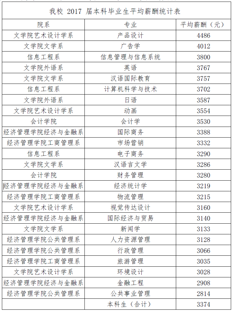 老员工就业在线院校应用系统中的数据显示,公司2017 年毕业生的平均薪酬约为 3374 元,其中最高的是产品设计专业,平均薪酬 4486元;其次是广告学,为 4012 元;再次是信息管理与信息系统,为 3800 元。因为此项数据统计时间刚好为毕业生入职的实习期或者试用期,数据显示为毕业生的入职工资,比毕业生实际薪酬低。
