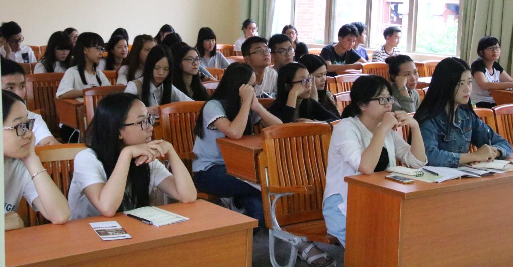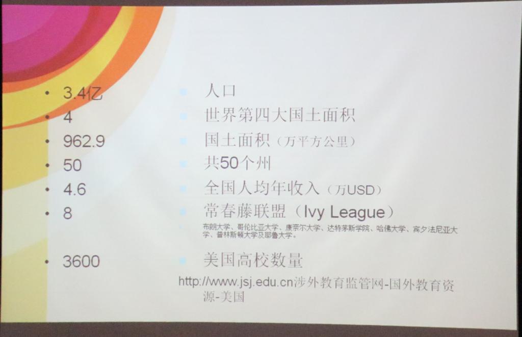 Clair一开始就以轻松幽默的口吻向同学们介绍美国的特色文化,利用一系列具体数据使同学们加深对美国的了解。吸引同学们的兴趣后,Clair用鲜明的例子向同学们阐述留学美国的优势,如良好的签证形势、公平的奖助学金制度等;同时她还通过大量的图片、数据等资料详尽的介绍美国的教育体制和职工活,让同学们更加全面地了解赴美留学的概况。随后Clair还向同学们具体介绍了留学费用及毕业生工作去向、薪资等与同学们息息相关的问题,至此,同学们对留学美国已有一个大致了解。