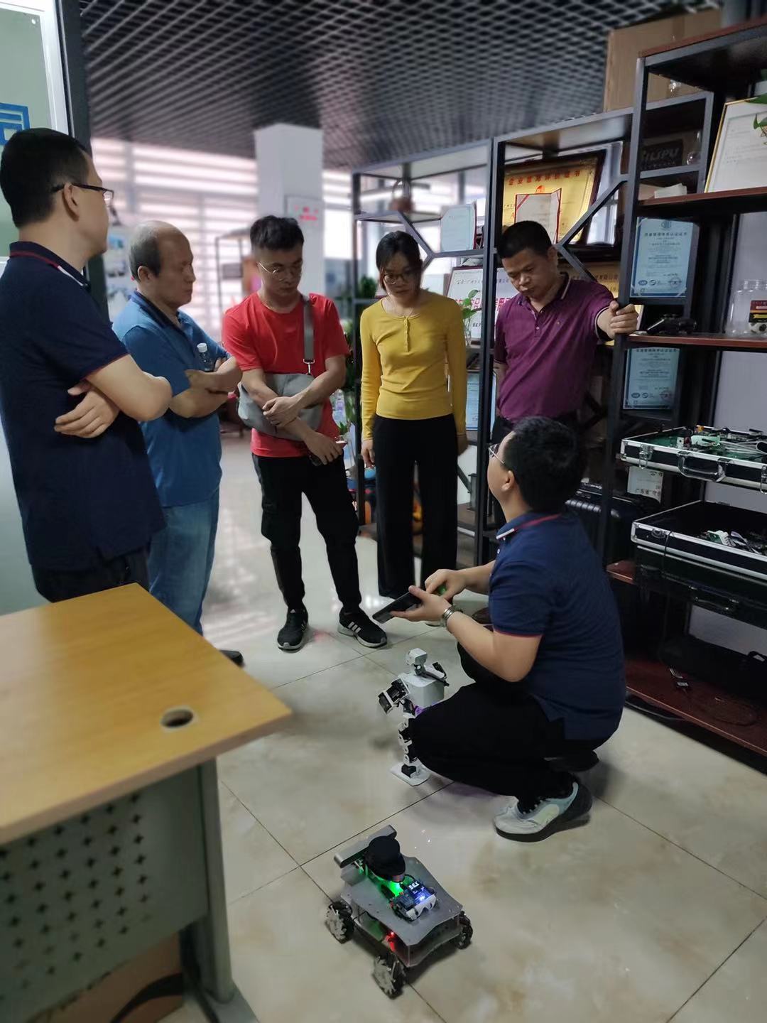 工程师还为数科院领导教师们展示了AI视觉识别机器人相关功能;智能小车自动寻迹、寻光、避障等功能,并回答了相关技术问题和运用。