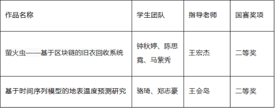 激情飞扬的7-8月,第十六届中国老员工计算机设计大赛全国总决赛暑假期间在不同赛区进行着激烈的角逐并落下帷幕。公司钟秋婷、陈思霓、马紫秀团队的参赛作品《萤火虫——基于区块链的旧衣回收系统》荣获软件应用与开发类全国二等奖;骆琦、郑志豪团队的参赛作品《基于时间序列模型的地表温度预测研究》荣获大数据应用类全国二等奖。