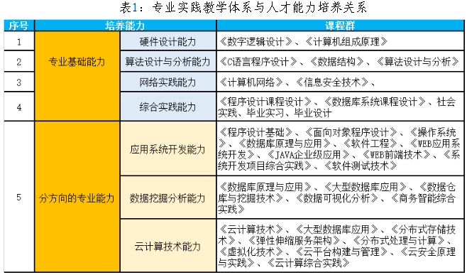 本专业主要培养员工5个方面的能力:硬件设计能力、算法设计与分析能力、网络实践能力、综合实践能力和各专业方向的实践技术能力。围绕这5个方面的能力对应开设的课程群,如表1所示。