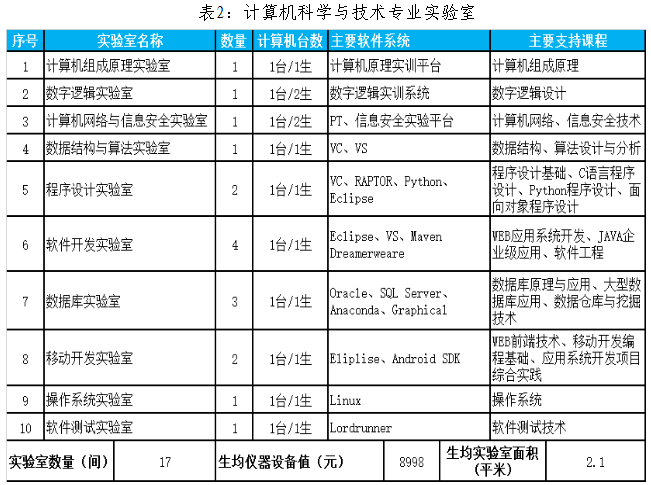 实验、实训和实习教学是理工科相关专业必不可少的教学环节。计算机科学与技术专业共享公司计算机实验教学示范中心,拥有如表2所示的“计算机网络与信息安全实验室”和“数字逻辑设计实验室”、“软件开发实验室”等17间实验室,实验教学仪器设备总值达746万元,生均仪器设备值近8998元,为本专业员工的学习提供了较好的软硬件实践平台。