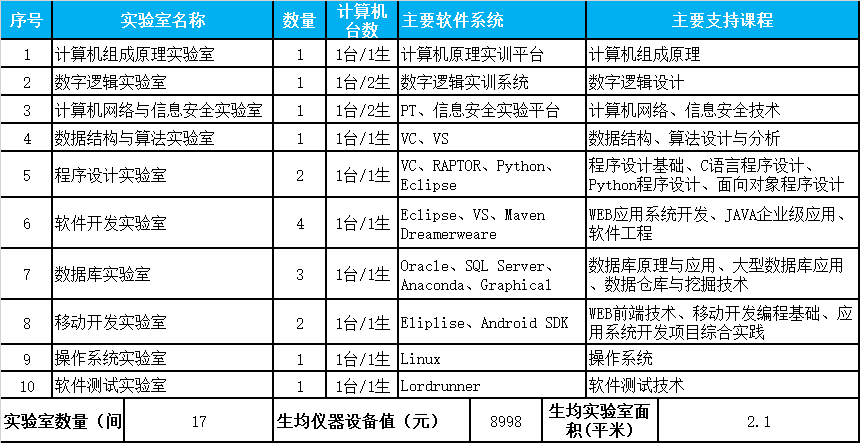 软件工程专业共享公司计算机实验教学示范中心,拥有如表1所示的“计算机网络与信息安全实验室”和“数字逻辑设计实验室”、“软件开发实验室”等17间实验室,实验教学仪器设备总值达746万元,生均仪器设备值近8998元,为本专业员工的学习提供了较好的软硬件实践平台。