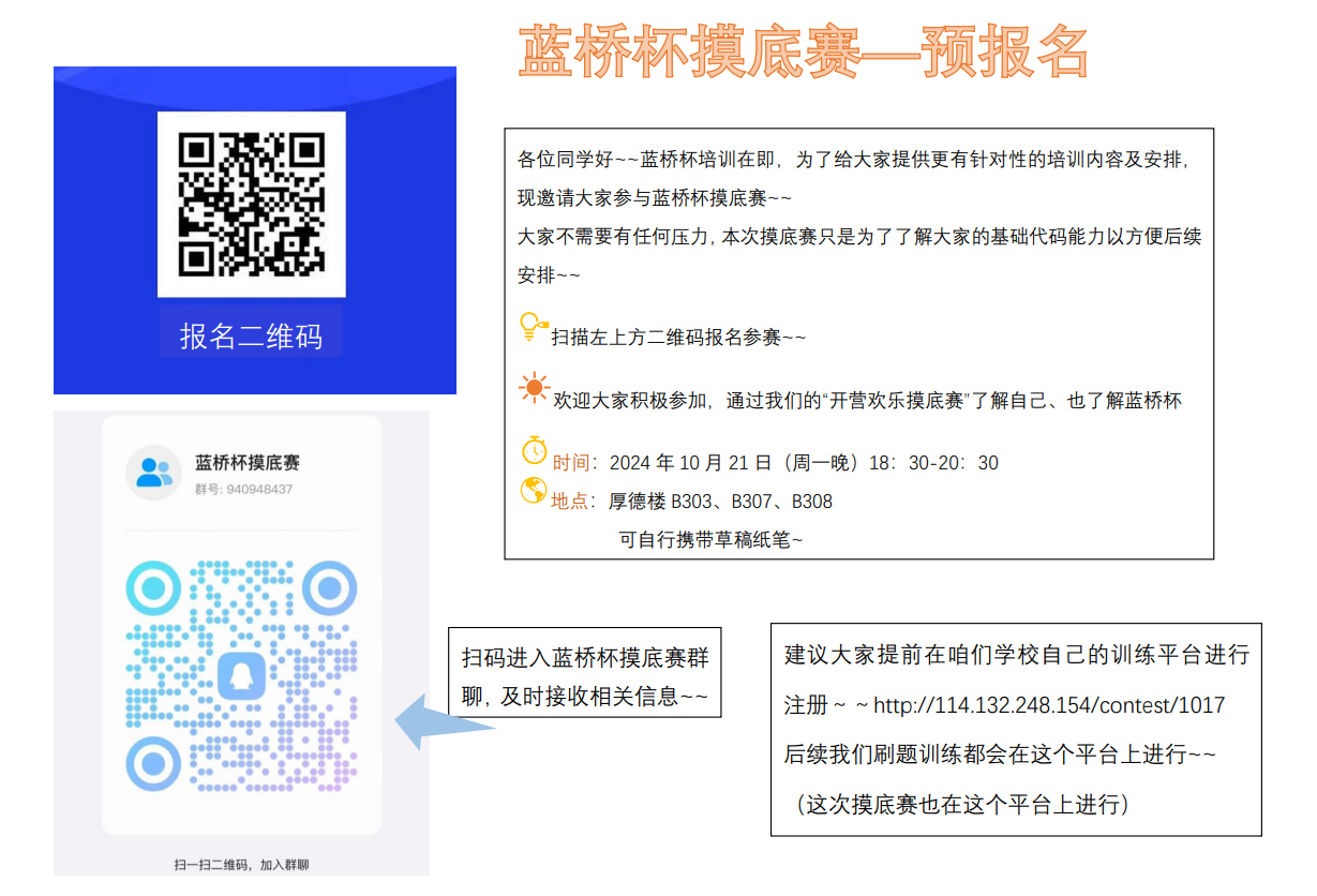 当然,此次比赛更多的是让同学们了解蓝桥杯这项比赛,可以扫描图片中的二维码进群,后续会有进行更多的相关培训,同时同学们也可以提前在公司的平台进行注册http://114.132.248.154/contest/1017,并进行刷题。