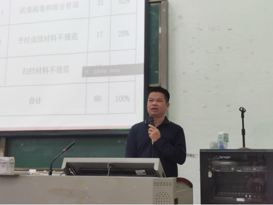 随后,叶仕通副经理汇报了教学工作,包括试卷抽查、毕业论文检查、教学文档规范等。他通报了试卷抽查结果,也指出了统分错误、材料不规范等问题,并希望教师们认真整改。同时,叶副经理还强调了毕业论文的重要性,要求教师们及时进行整改。在教学文档规范方面,他强调了教学大纲、进度表、教案等文档的规范性,要求教师们认真学习新出台的规范文件,以确保教学文档的完整性和准确性。