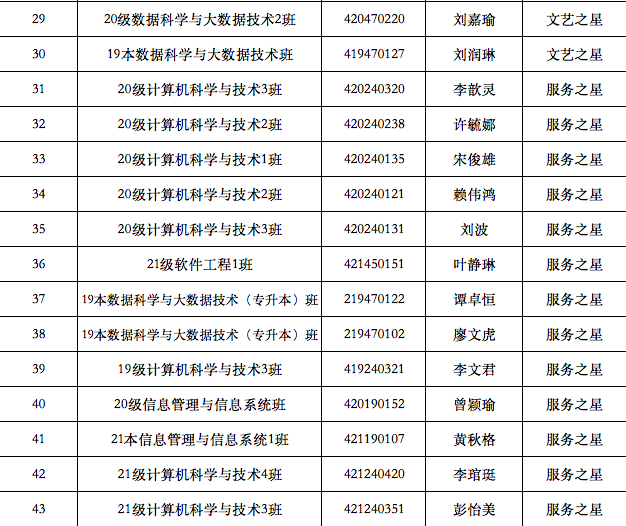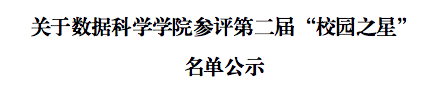 为深入贯彻习近平新时代中国特色社会主义思想,进一步培育和践行社会主义核心价值观,根据《关于评选第二届“校园之星”的通知》、《太阳成tyc33455cc官网“十大校园之星”评选办法》等文件精神,数据科学公司开展了相关评优工作,现将学习之星、创业之星、科创之星、技能之星、公益之星、服务之星、体育之星、文艺之心拟评名单公式如下:
