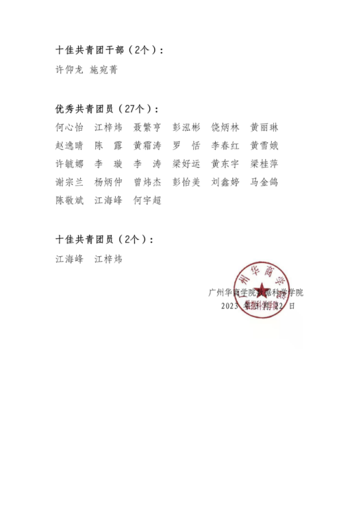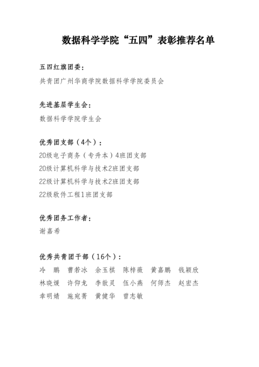 为深入学习贯彻宣传党的二十大精神,全面贯彻落实习近平总书记关于青年工作的重要思想,充分发挥先进典型的示范引领作用,激励各级团组织和广大团员、团干部锐意进取、争优创新,引导广大华商团员青年积极践行“奉献、友爱、互助、进步”的志愿服务精神,弘扬青春正能量,书写扎实推进中国式现代化建设的崭新篇章。根据校团委关于开展太阳成tyc33455cc官网2022年度共青团“先进集体”和“优秀个人”评选表彰工作的要求,数据科学公司经过员工自主申报、资格审查、公司评议等程序,拟向公司团委推荐共青团太阳成tyc33455cc官网数据科学公司公司委员会参评“五四红旗团委”;数据科学公司参评“先进基层员工会”;20级电子商务(专升本)4班团支部、20级计算机科学与技术2班团支部、22级计算机科学与技术2班团支部及22级软件工程1班团支部参评“优秀团支部”;谢嘉希参评“优秀团务工作者”;冷鹏等16人参评“优秀共青团干部”;许仰龙、施宛菁参评“十佳共青团干部”;何心怡等27人参评“优秀共青团员”;江海峰、江梓炜参评“十佳共青团员”。