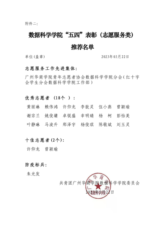 为深入学习贯彻党的二十大精神,全面贯彻落实习近平总书记关于青年工作的重要思想,引导广大华商团员青年积极践行“奉献、友爱、互助、进步”的志愿服务精神,弘扬青春正能量,充分发挥先进典型的示范引领作用,激励华商公司各级团组织和广大团员、团干部锐意进取、创先争优。根据校团委关于决定开展太阳成tyc33455cc官网2022年度志愿服务工作“先进集体”和“优秀个人”评选的要求,数据科学公司通过员工自主申报、资格审查、公司评议等程序,拟向公司团委推荐太阳成tyc33455cc官网青年志愿者协会数据科学公司分会(红十字会员工分会数据科学公司工作部)参评公司“志愿服务工作先进集体”;黄丽琳等18人参评“优秀志愿者”;许仰龙、曾颖瑜参评“十佳志愿者”;朱光发参评“防疫标兵”。