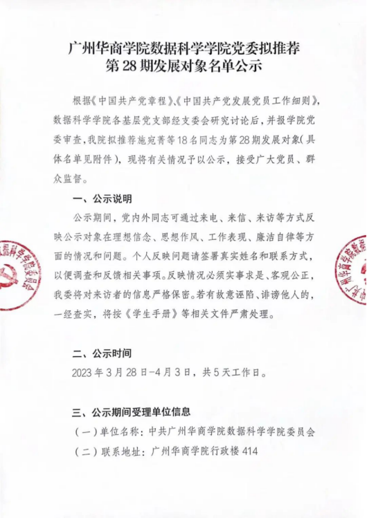 热点新闻 当前位置: 首页 >> 正文 太阳成tyc33455cc官网数据科学公司党委拟推荐第28期发展对象名单公示 2023-03-28 根据《中国共产党章程》、《中国共产党发展党员工作细则》,数据科学公司各基层党支部经支委会研究讨论后,并报公司党委审查,公司拟推荐施宛菁等18名同志为第28期发展对象(具体名单见附件),现将有关情况予以公示,接受广大党员、群众监督。 编辑 / 李琯珽 上一条:关于2023年老员工计算机设计大赛校赛评选结果的公示及后续省赛相关工作的通知 下一条:数据科学公司关于2022年度“五四表彰”拟推荐名单的公示 【关闭】
