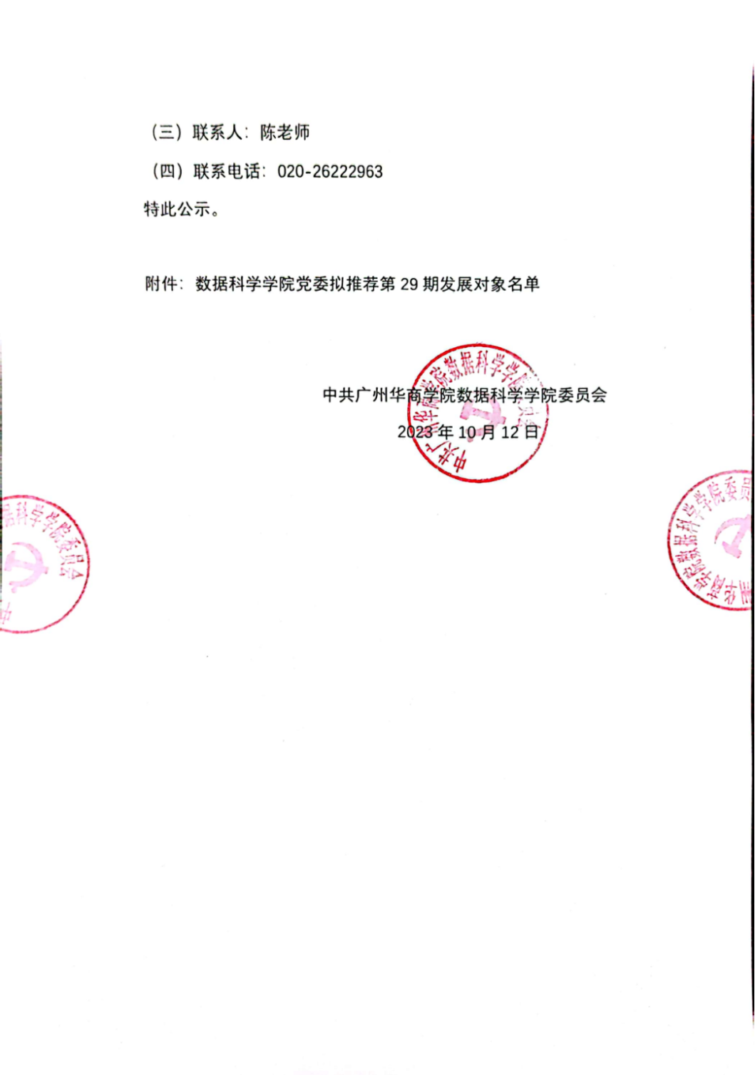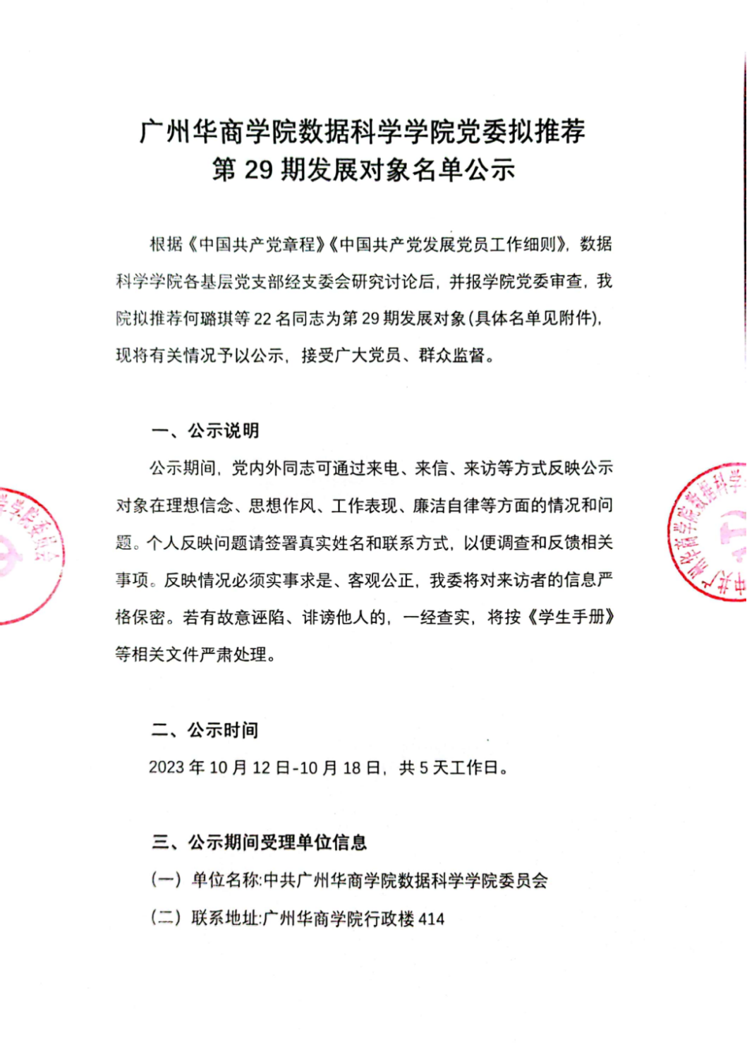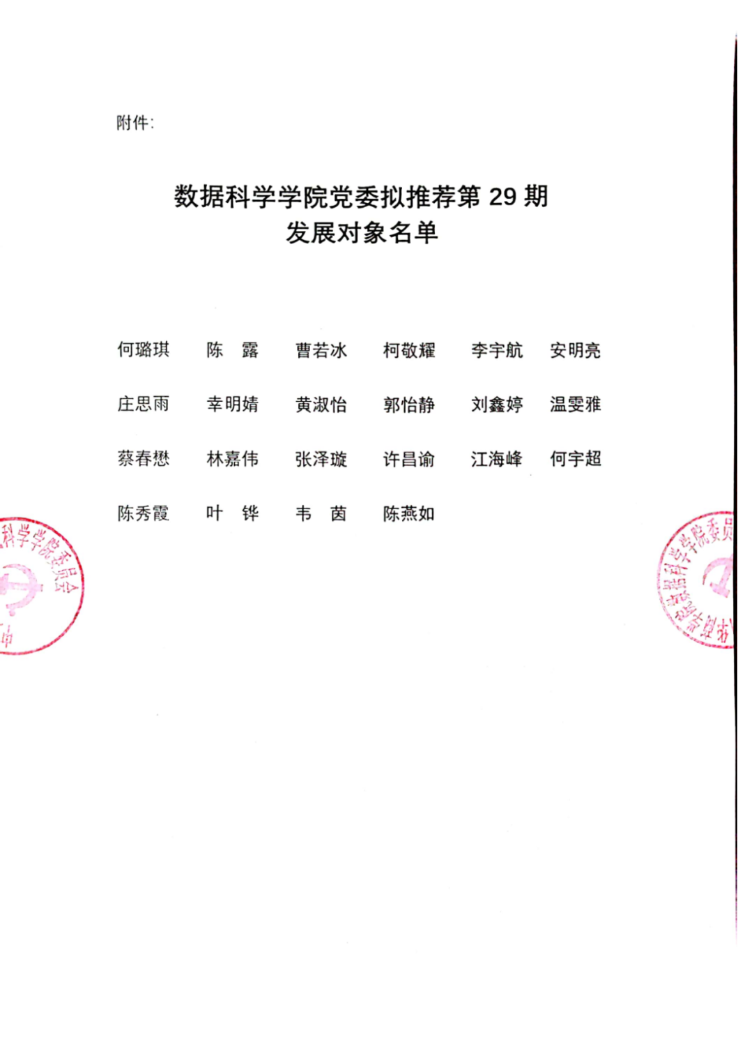 热点新闻 当前位置: 首页 >> 正文 太阳成tyc33455cc官网数据科学公司党委拟推荐第29期发展对象名单公示 2023-10-13 根据《中国共产党章程》、《太阳成tyc33455cc官网发展党员工作实施细则(试行)》等相关文件规定,结合组织工作实际情况,数据科学公司各基层党支部开展选拔入党积极分子举荐拟确定为发展对象。经过统一笔试、个人谈话、组织考察、综合考察材料、群众意见和推优工作小组及支委会研究讨论,并报公司党委审查,公司拟举荐何璐琪等22 名同志为第 29 期发展对象(具体名单见附件),现将有关情况予以公示,接受广大党员、群众监督。现予以公示如下: 上一条:关于开办人工智能大模型专家讲座的通知 下一条:公司资讯 | 数据科学公司2022-2023学年优秀员工干部初审名单公示 【关闭】