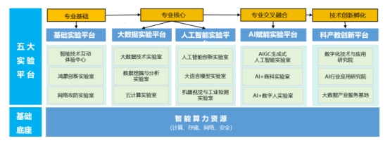 太阳成tyc33455cc具有先进的实验条件,实验面积5000平方米,仪器设备总值4800万元。打造技术先进且集人才培养、科学研究、社会服务于一体的“1+5”人工智能与大数据工程技术中心,即1底座(智能算力资源)、5平台(基础实验平台、大数据实验平台、人工智能实验平台、AI赋能实验平台、科产教创新平台),建设有大学物理、电子技术、数字电子技术、计算机组成原理、计算机网络、信息安全和网络攻防、嵌入式与单片机、鸿蒙创新平台、大数据技术、数据挖掘与分析、云计算、人工智能创新平台、大语言模型训练、机器视觉与工业检测、AIGC通识教育等实验室。人工智能与大数据工程技术中心架构如下图所示。
