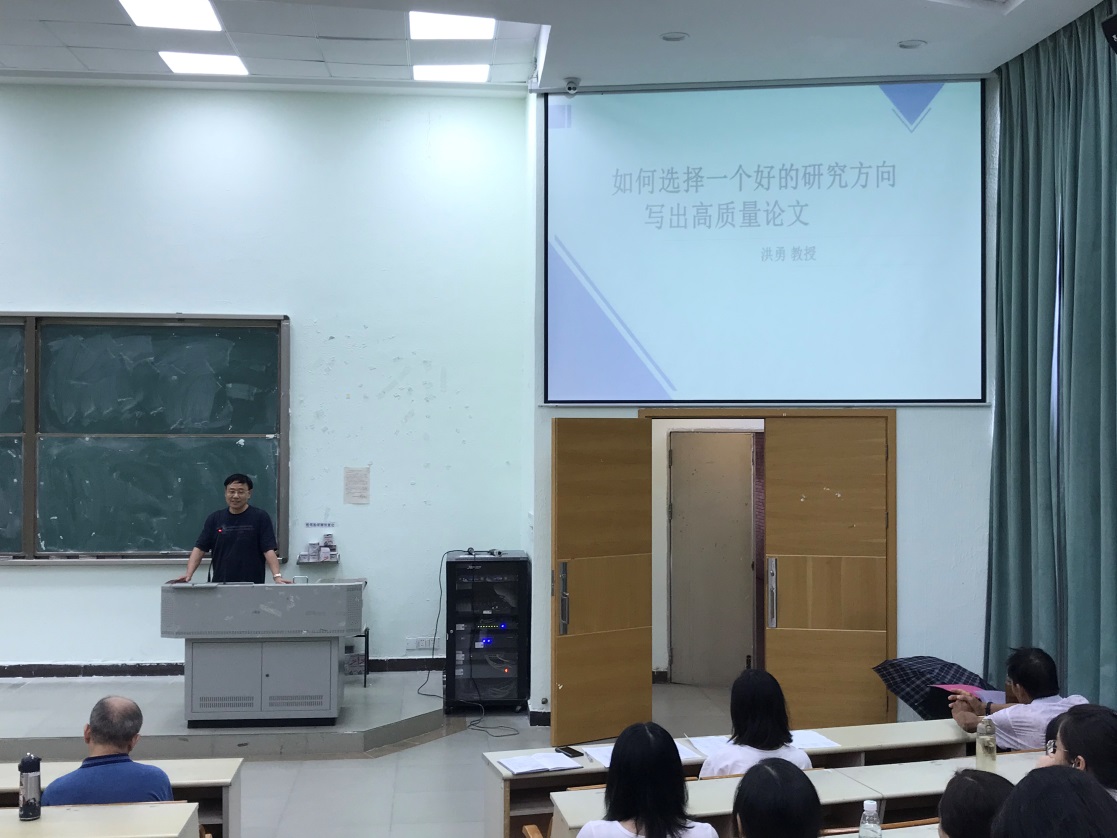 讲座一开始,洪勇教授首先介绍了大学老师和中小学老师的区别,直接点出对于大学老师而已,做科研论文和教书育人缺一不可,并提出一个合格的大学老师必须要做到“三个一”---教一门课,选好一个主要研究方向,写好一专著;三个一是互相促进不可分离的。