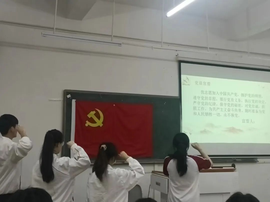 在施宛菁同志的带领下,3位转正党员宣读入党誓词。入党誓词:我志愿加入中国共产党,拥护党的纲领,遵守党的章程,履行党员义务,执行党的决定,严守党的纪律,保守党的秘密,对党忠诚,积极工作,为共产主义奋斗终身,随时准备为党和人民牺牲一切,永不叛党。