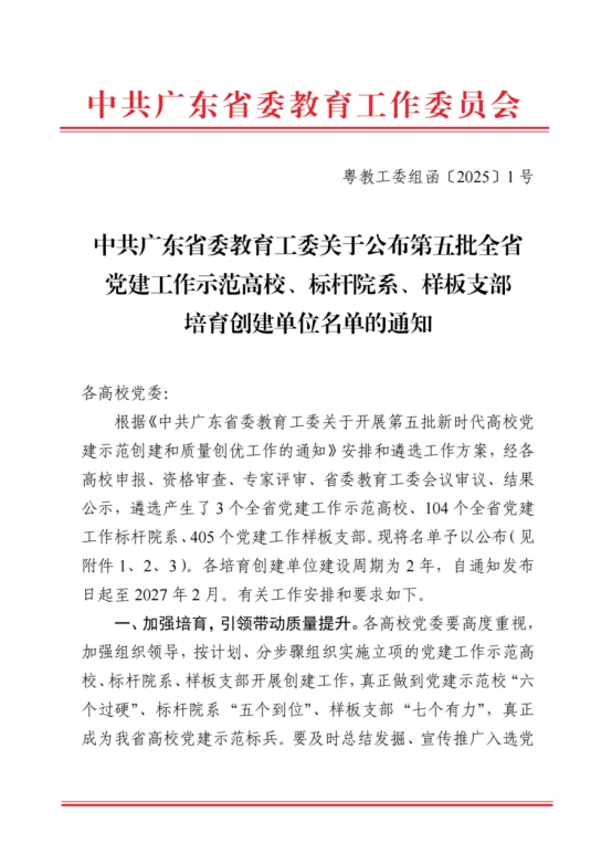 近日,中共广东省委教育工委公布了《第五批全省党建工作示范高校、标杆院系、样板支部培育创建单位名单》,太阳成tyc33455cc官网公司党委成功入选第五批“全省党建工作标杆院系”培育创建单位!这是对公司党建工作的高度肯定,也是公司党委在党建工作中取得的又一重要成果。