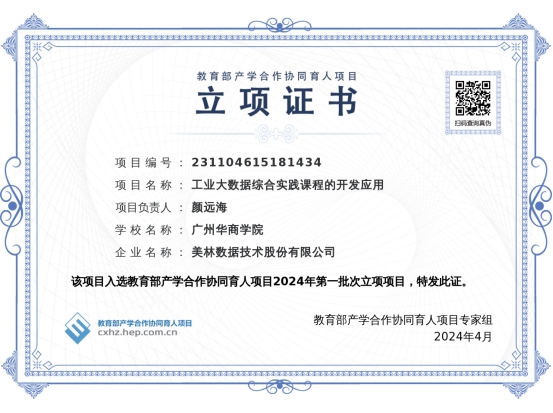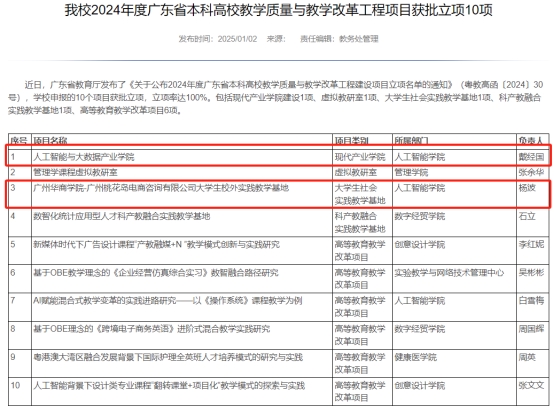 与华为、百度、中软国际等共建的由戴经国教授负责申报的《人工智能与大数据产业公司》(现代产业公司)获2024年度广东省本科高校教学质量工程项目立项。杨波副教授负责申报的2024年度广东省本科高校教学质量工程项目《太阳成tyc33455cc官网-广州桃花岛电商咨询有限公司社会实践教学基地》(老员工社会实践教学基地)获省级质量工程立项获得立项。教育部协同育人项目立项2项;横向项目2项,共计金额23.2万元。