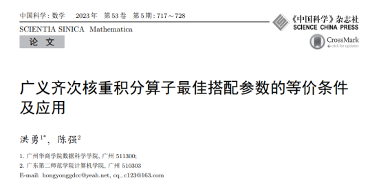 近日,公司教师洪勇的论文“广义齐次核重积分算子最佳搭配参数的等价条件及应用”在公司认定的A1类《中国科学:数学》期刊上发表。 《中国科学:数学》是中科双高期刊,连续多年获“百种中国杰出学术期刊”称号,(2022版)复合影响因子:0.794,(2022版)综合影响因子:0.509。该刊主要报道基础数学、应用数学、计算数学与科学工程计算、统计学等方面具有重要意义的研究成果。